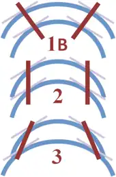 Los pliegues que mantienen un espesor de capa uniforme se clasifican como pliegues concéntricos. Los que no lo hacen se denominan pliegues similares. Los pliegues similares tienden a mostrar un adelgazamiento de las extremidades y un engrosamiento de la zona de bisagra. Los pliegues concéntricos están causados por la deformación debida al pandeo activo de las capas, mientras que los pliegues similares suelen formarse por alguna forma de flujo de cizallamiento en la que las capas no son mecánicamente activas. Ramsay ha propuesto un esquema de clasificación para los pliegues que a menudo se utiliza para describir los pliegues de perfil basado en la curvatura de las líneas internas y externas de un pliegue y el comportamiento de los isógonos de buzamiento, es decir, líneas que conectan puntos de igual buzamiento en superficies plegadas adyacentes.[16]