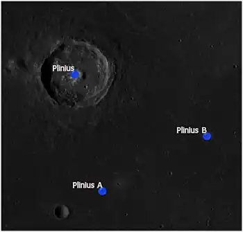 Los cráteres satélite son pequeños cráteres situados próximos al cráter principal, recibiendo el mismo nombre que dicho cráter acompañado de una letra mayúscula complementaria (incluso si la formación de estos cráteres es independiente de la formación del cráter principal). Por convención, estas características son identificadas en mapas lunares poniendo la letra en el punto medio del borde del cráter que se encuentre más cercano al Plinius.