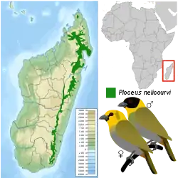 El tejedor malgache (Ploceus nelicourvi)[2] es una especie de ave paseriforme de la familia Ploceidae endémica de Madagascar. Estudios recientes lo sitúan en el género Nelicurvius junto a su pariente más cercano, el tejedor sakalava. Es un pájaro de aspecto similar a un gorrión que mide unos 15 cm y pesa entre 20–28 g. Los machos tienen el pico negro, al igual que su rostro, mientras que su nuca y cuello son amarillos, partes superiores verde oliváceas, con plumas de vuelo negruzcas con bordes verdosos. Su vientre es gris, y las coberteras inferiores de la cola son de color castaño. El plumaje de los machos fuera de la época de cría es grisáceo moteado con la cabeza verde. Las hembras en la época de cría tienen la parte frontal de la cabeza amarilla y la posterior verde olivácea, con una ancha lista superciliar amarilla. Las hembras en época de cría tienen la cabeza y el pecho amarillo con una mancha olivácea en las auriculares. Construye nidos aislados con forma de retorta que cuelgan de las ramas, lianas y bambús. Se alimentan principalmente de insectos, que buscan en solitario o en pequeños grupos, a menudo en compañía del bulbul tetraka. Su hábitat natural son los bosques húmedos de montaña y tierras bajas. Según su estado de conservación se clasifica como especie bajo preocupación menor.[1]