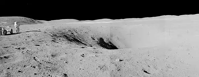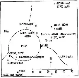 ![]() Panorama del cráter Plum. El comandante de la misión John Young aparece a la izquierda. Los astronautas tomaron muestras del suelo situado en primer plano y una roca en el borde distal del cráter. La muestra 61016, llamada Big Muley, está justo encima del extremo derecho de la sombra de Young. |