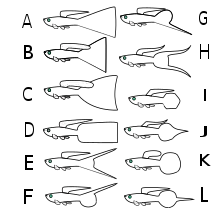 ![]() Ejemplar de guppy macho. Se caracteriza por la aleta anal transformada en gonopodio, su tamaño más pequeño y, especialmente, por las múltiples variedades e intensidades de sus colores, y tienen una aleta inferior a la otra además de las diversas formas de colas (aletas caudales) que pueden tener. | ||