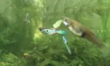 La elección de apareamiento de la hembra también puede estar influenciada por la elección de otra hembra. En un experimento, las hembras de guppy observaron a dos machos, uno solitario y otro cortejando activamente a otra hembra, y se les dio a elegir entre los dos. La mayoría de las hembras pasaban más tiempo junto al macho que estaba cortejando.[19] La preferencia de los guppys hembra por los machos en forma permite a sus descendientes heredar una mejor forma física y mayores posibilidades de supervivencia.