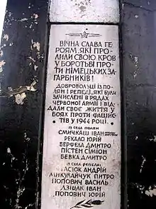 | ¡Gloria eterna a los héroes que derramaron su sangre en los combates contra los agresores alemanes! A los voluntarios de Poienile y Repedea, que quisieron alistarse en las filas del Ejército Rojo y dieron su vida como soldados contra los fascistas en el año 1944. | Slava eroilor care au vărsat sângele lor în luptele în faţa agresorilor germani ! Voluntarii din Poienile şi Repedea, carevroiau să se inscrie în rândurile Armatiei Roşii şi îşi dădeau viaţa precum soldaţi împotrivă fascistilor în anul 1944.- |