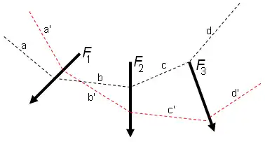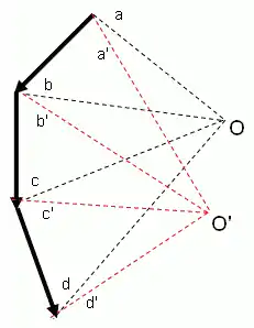 - Se consideran el segundo, tercero, ..., n-ésimo radio polar y se dibujan segmentos paralelos entre las rectas de acción de las fuerzas originales, uno a continuación de otro.