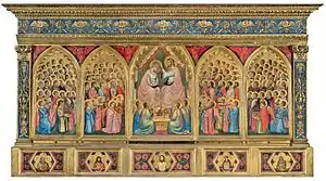 El políptico, que hoy está insertado en un marco renacentista (y que ha alterado la forma original, mutilando la parte alta del panel central), se divide en cinco compartimentos. En el centro está la Coronación de la Virgen y, a los lados, una representación de todos los santos con ángeles músicos, que evocan el paraíso. En cada compartimento de la predela hay un hexágono con el busto de Cristo en el centro y bustos de santos a los lados (de izquierda a derecha: un santo obispo, Juan Bautista, San Francisco y San Onofre).
