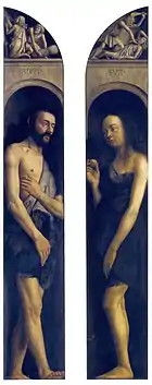 Los paneles superiores de los extremos representan a Adán y Eva, a izquierda y derecha respectivamente. Están desnudos, no idealizados, sino con cuerpos extremadamente reales. Probablemente el artista se situó frente a modelos desnudos que reprodujo con honestidad.[9]