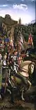 Junto al panel central hay paneles laterales que también representan a grupos de personas. Los paneles de la izquierda muestran a Los Jueces Justos y a los caballeros cristianos. A la derecha, se encuentran los ermitaños y a los peregrinos, acompañados por el gigante San Cristóbal, patrón de los viajeros.