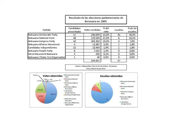 Por otra parte, el presidente es el jefe de Estado y de gobierno. El parlamento está dividido en la Casa de Jefes de Botsuana - cámara alta - y la Asamblea Nacional de Botsuana - cámara baja - dominada desde la independencia por el Partido Democrático de Botsuana.