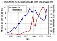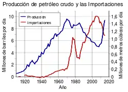 La producción de petróleo de los Estados Unidos alcanzó su máximo nivel en 1970 y después comenzó a declinar. Para 2005 las importaciones alcanzaron casi dos veces el monto de la producción.