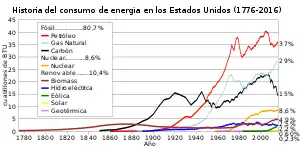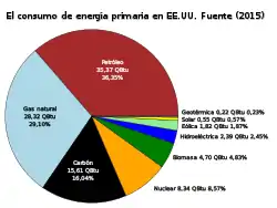 El consumo de energía primaria en Estados Unidos está cerca del 86% de todos los tipos de energía utilizada en los que se deriva los combustibles fósiles. En 2013, la mayor fuente de energía del país se dio a partir del petróleo (36%), seguido por el gas natural (27%), el carbón (19%), y por la energía nuclear (8%). El 10% restante fue suministrado por represas hidroeléctricas, y fuentes renovables.[13]