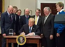 El 30 de junio de 2017, el presidente Donald Trump firmó una orden ejecutiva para restablecer el Consejo Nacional del Espacio, presidido por el vicepresidente Mike Pence. La primera solicitud de presupuesto de la administración Trump mantiene los programas de vuelos espaciales tripulados de la era Obama: naves espaciales comerciales para transportar astronautas hacia y desde la Estación Espacial Internacional, el Sistema de lanzamiento espacial del gobierno y la nave espacial Orión para misiones en el espacio profundo, mientras reduce la investigación científica sobre la Tierra y elimina la oficina de educación de la NASA.[5]