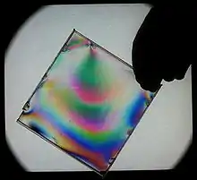 Imagen de un plástico sometido a tensión en un ensayo de fotoelasticidad.