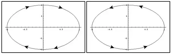 Representación de los casos de polarización elíptica: Polarización elíptica dextrógira (gira en sentido de las agujas del reloj) y Polarización elíptica levógira (gira en sentido contrario a las agujas del reloj).