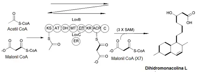 Las PKS tipo I modulares están organizadas en series de subunidades enzimáticas que reducen parcial o totalmente (o pueden no reducir) el grupo ceto formado, de acuerdo a la codificación de las subunidades KR, DH y ER. Cada unidad produce una elongación de la cadena:[1]