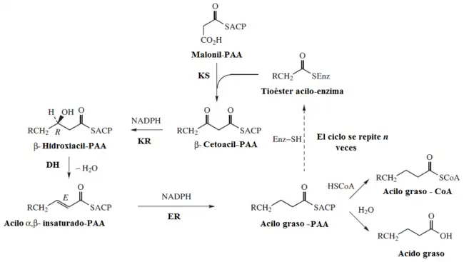 Una ácido graso sintasa (FAS) es un complejo multienzimático que realiza primero una condensación tipo Claisen con descarboxilación entre una unidad de malonilo unido a una subunidad de una proteína acarreadora de acilos (PAA o en inglés ACP) y un sustituyente acetilo unido a la enzima. La condensación la realiza una subunidad de cetosintasa (KS). En el caso de las FAS, se lleva a cabo una reducción biológica del grupo carbonilo de β-cetoácido hasta un grupo metileno, primero reduciendo al alcohol (Ceto reductasa, KR), deshidratando el alcohol formado (Deshidratasa, DH) e hidrogenando el alqueno (Enoil reductasa, ER). Este ciclo de reducciones se repite progresivamente, dando así un ácido graso: