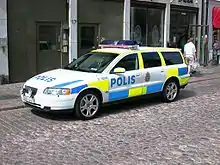 En la mayor parte del siglo XX, los vehículos de la policía sueca fueron pintados de negro y blanco. En 2005, los coches de la policía sueca cambiaron a un color amarillo y azul fluorescente (marcas Battenburg). La mayoría de coches de la policía sueca son Volvo o Saab, con la misma imagen en toda Suecia.