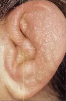 La policondritis recidivante es una enfermedad inflamatoria sistémica de etiología desconocida, caracterizada por la presencia de lesiones recurrentes en las estructuras cartilaginosas, órganos de los sentidos y sistema cardiovascular.[1] Principalmente afecta al pabellón auricular, tabique nasal, laringe, tráquea y articulaciones.[2] En ocasiones se puede relacionar con otras enfermedades autoinmunes sistémicas.