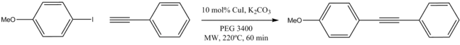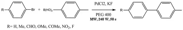 - Namboodiri, Vasudevan; Varma, Rajender (2001). «Microwave-accelerated Suzuki cross-coupling reaction in polyethylene glycol (PEG)». Green Chemistry 3 (3). p. 146.