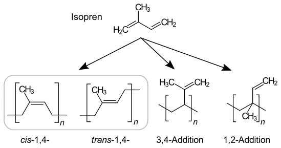 En principio, la polimerización del isopreno puede dar como resultado cuatro isómeros diferentes. La cantidad relativa de cada isómero en el polímero depende del mecanismo de la reacción de polimerización.