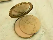 El polvo compacto está disponible en diferentes tonos y se vende en un envase compuesto. Está comprimido para proporcionar un producto apto para viajes y retoques sobre la marcha.[44] Los polvos compactos cubren el rostro y ocultan las imperfecciones y la decoloración, por lo que se pueden utilizar como base de cobertura ligera.[45] Las partículas del polvo compacto son más grandes que las del polvo suelto y pueden emitir una apariencia espesa y coagulada cuando se usan en exceso.[43] El polvo compacto también se puede utilizar para fijar el maquillaje.