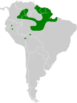 Se encuentra en Brasil, Colombia, Ecuador, la Guayana francesa, Guyana, Perú, Surinam y Venezuela.[1]