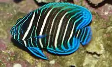 Los especímenes jóvenes tienen la coloración negra, con estrechas rayas blancas y azules verticales, que están curvadas en sus extremos. Las aletas están bordeadas de azul.