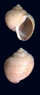 Concha delgada, globosa-oblonga; espiral algo alargada; ápice agudo, castaño rojizo oscuro; vueltas oblicuas redondeadas en la parte superior; luego convexas, suaves, brillantes, cubiertas por un periostracum deciduo, delgado de color verde pálido; sutura distinta; ombligo más bien estrecho y profundo; abertura ovoide, algo oblicua; labio externo delgado; columela casi vertical, algo reflejada; callo parietal blanco azulado, delgado. Opérculo delgado, coriáceo, de forma semilunar alargada, un poco cóncavo y anguloso sobre la superficie externa. Margen colmenar sinuoso