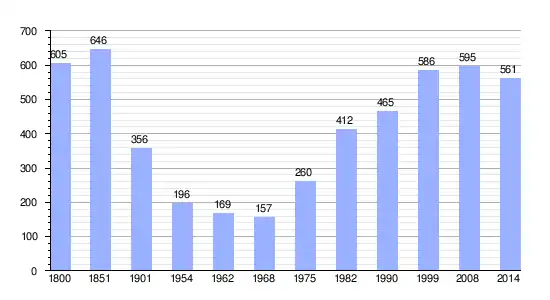 Los datos demográficos contemplados en este gráfico de la comuna de Pommiers-la-Placette[4] se han cogido de 1800 a 1999 de la página francesa EHESS/Cassini, y los demás datos de la página del INSEE.[5]