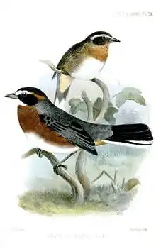 El canto en P. whitii es complejo y se diferenciar marcadamente de un individuo a otro. Se compone de una sucesión rítmica de un número variable de notas melódicas simples (entre 8 y 12), entre las cuales mezcla irregularmente notas melodiosas y algunos trillados. En P. nigrorufa el canto simple, repitiendo, en un número variable de veces, una frase compuesta por 3 silbidos puros, cuyo orden general y forma son muy consistentes en toda la geonemia de la especie.[17]