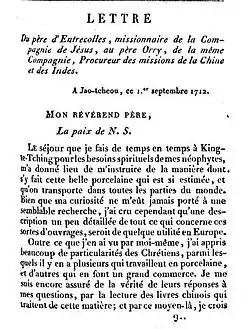 El jesuita francés Francois Xavier d'Entrecolles en 1712 describió el proceso chino de fabricación de porcelana en sus cartas a Europa. «La porcelana de pasta dura, se refiere principalmente a formulaciones preparadas a partir de mezclas de caolín, feldespato y cuarzo. También se puede utilizar otras materias primas que incluyen trozos de cerámica, que son conocidas como petunse.»[6]