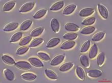 Micrografía DIC de 1000x de esporas de Psilocybe.