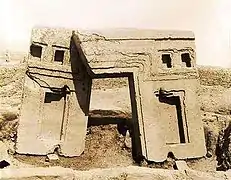 - Estado de la pieza durante las primeras excavaciones realizadas entre 1903 y 1904, según el registro fotográfico de Arthur Posnansky.