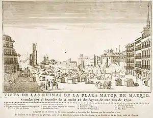 El 16 de agosto de 1790 tuvo lugar un incendio en la Plaza Mayor de Madrid, narrado en estos términos en el Memorial literario instructivo y curioso de la Corte de Madrid:[5]