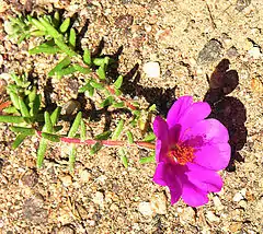Tiene tallos lisos, carnosos, mayormente postrados; rojizos con pelos axilares, y con rámulos; hojas alternas en conjuntos en el tallo y en su extremo. Las flores solitarias, rojo purpúreas, sésiles, con cinco partes regulares y 6 mm de ancho. Pétalos redondos, escotados en el ápice. Florece a fines de primavera, y continua hasta mediados del otoño. Frutos cápsulas subglobosas, sésiles, semillas pequeñas de 0,5 mm pardusco amarillentas. Tolera muy bien sequía.