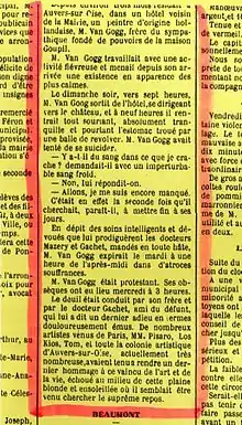 La muerte y funeral de Van Gogh fue informado por el diario local Le Régional en su edición del 7 de agosto de 1890. El artículo informa con claridad que Van Gogh padeció en su agonía, expirando después de "terrible sufrimiento" (dans d'atroces souffrances), un dato confirmado por Hirschig en una carta de 1911 a Albert Plasschaert. Theo grabó las últimas palabras de Vincent como "la tristeza durará para siempre" en una carta a su hermana Elisabeth datada el 5 de agosto de 1890.[11]