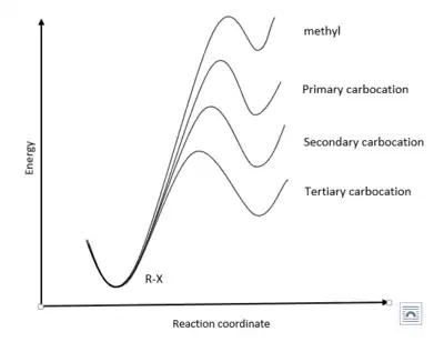 El postulado de Hammond se puede utilizar para comparar las estructuras de diversos carbocationes en las reacciones SN1. Se sabe que las estabilidades relativas de los carbocationes disminuyen según el tipo del carbocatión: terciario>secundario>primario>metilo. Por lo tanto, de acuerdo con el postulado de Hammond, en el diagrama de la coordenada de reacción para esta reacción de ruptura del enlace para formar el carbocatión se puede extraer: