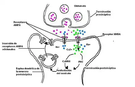 La inducción de la PLP en la región CA1 del hipocampo depende de cuatro factores postsinápticos: despolarización postsináptica, activación de receptores NMDA, entrada de Ca2+ y activación por el Ca2+ de varios sistemas de segundos mensajeros en la célula postsináptica.[9] Recientes estudios permitieron aclarar los mecanismos responsables de la expresión de la PLP, o sea, de qué modo esta hace que las sinapsis estén fortalecidas durante periodos prolongados. La explicación más probable es que la PLP se origina en cambios en la sensibilidad de la célula postsináptica al glutamato, las sinapsis excitadoras pueden regular dinámicamente sus receptores glutamatérgicos postsinápticos e incluso pueden agregar receptores AMPA nuevos a sinapsis “silenciosas” que no tenían receptores AMPA con anterioridad. Al parecer la expresión o el mantenimiento de la PLP se debe a esta inserción de receptores AMPA en la membrana postsináptica.[10] La inducción de PLP solo requiere fenómenos en la célula postsináptica, mientras que la expresión de la PLP se debe en parte a un fenómeno posterior en la célula presináptica (el aumento de la liberación de transmisor), de alguna manera de célula presináptica tiene que ser informada de que se ha inducido un PLP. Actualmente existen indicios de que o bien el calcio o bien algún segundo mensajero activado por el calcio, determina que la célula postsináptica libere uno o más mensajeros retrógrados de sus espinas dendríticas activas. Experimentos recientes proponen al óxido nítrico (NO) como posible mensajero retrogrado involucrado en la PLP.