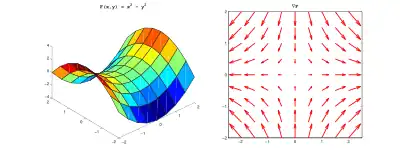 donde ∇P es el gradiente de P y la segunda parte de la ecuación es menos el gradiente para una función del coordenadas cartesianas. x, y, z.[2]. En algunos casos, los matemáticos pueden utilizar un signo positivo delante del gradiente para definir el potencial.[3] Debido a esta definición de P en términos del gradiente, la dirección de F en cualquier punto es la dirección de la disminución más pronunciada de P en ese punto, su magnitud es la tasa de esa disminución por unidad de longitud.