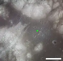![]() Localización de Powell en el valle Taurus-Littrow. El Macizo sur se halla abajo a la izquierda, el Macizo Norte arriba en el centro, y Sculptured Hills arriba a la derecha. La barra de escala representa 5 km. | ||