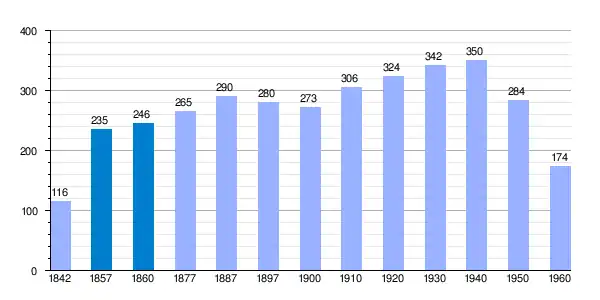 | Gráfica de evolución demográfica de Pozancos[7] entre 1842 y 1960 |