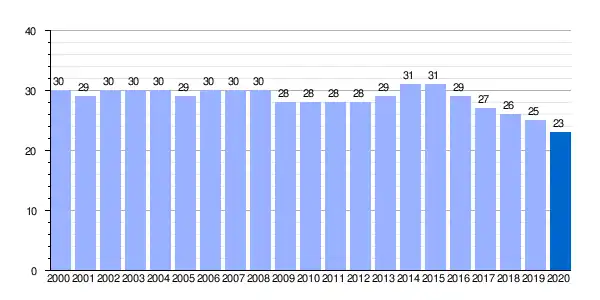 | Gráfica de evolución demográfica de Calzadilla de la Cueza entre 2000 y 2020 |