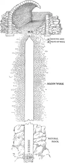 Aunque inicialmente llegó a tener una profundidad de 40 m, en 1881 el doctor C. A. Barclay, aprovechando que el pozo estaba seco, llevó a cabo varias excavaciones en el mismo, descubriendo que los escombros que habían caído —y piedras que habían sido arrojadas en él— habían reducido la altura real del pozo considerablemente.[6] En la actualidad, tiene unos 23 m de profundidad y 2,9 m de anchura.[7] Se encuentra excavado en piedra caliza y es alimentado por diversos manantiales cercanos, los cuales han permitido que siga teniendo agua.