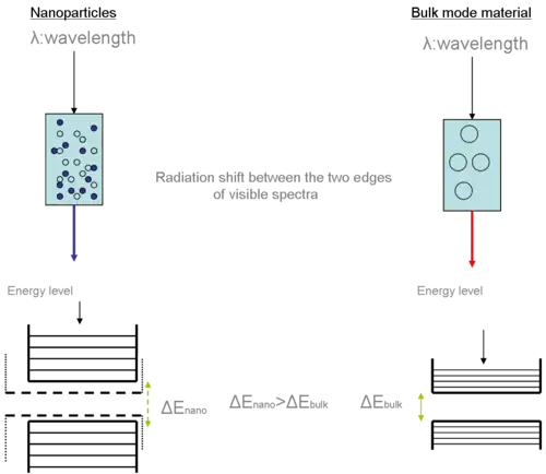 Las propiedades electrónicas y ópticas de materiales están afectadas por el tamaño y la forma. Logros técnicos bien asentados incluyendo los puntos cuánticos fueron obtenidos manipulando tamaños e investigando en la comprobación teórica del efecto de confinamiento cuántico.[3] La parte importante de la teoría es que el comportamiento del excitón se parece al de un átomo a medida que espacio circundante empequeñece. Una aproximación bastante buena del comportamiento de un excitón el comportamiento es el 3 -D modelo de una partícula en una caja.[4] La solución de este problema proporciona una conexión matemática única entre estados de energía y la dimensión espacial. Reduciendo el volumen o las dimensiones del espacio disponible, aumenta la energía de los estados. En el esquema se muestra el cambio en los niveles de energía del electrón y el salto de banda entre un nanomaterial y su sustancia material.