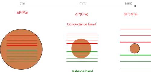 Bajo la suposición de forma esférica R1=R2=R y resolviendo la ecuación de Young-Laplace para los radios nuevos R(nm), se estima el nuevo ΔP(GPa). Cuanto más pequeño es R, mayor es la presión presente. El aumento en presión en la nanoescala resulta en fuertes fuerzas hacia el interior de la partícula. En consecuencia, la estructura molecular de la partícula parece diferente de la sustancia material, especialmente en la superficie. Estas anormalidades en la superficie son responsables de los cambios en las interacciones interatómicas y saltos de banda.[6][7]