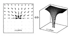 En la figura se muestra un gráfico de esta función en dos dimensiones. Esta trama se ha completado con un potencial interior proporcional a |x|2, que corresponde a un objeto de densidad uniforme, pero este potencial interior es generalmente irrelevante, ya que la órbita de las partículas materiales no pueden cruzarse con el cuerpo.