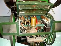 El coche tenía un motor Benz de dos cilindros y cuatro tiempos con encendido por chispa. Tenía dos velocidades con tracción en el eje trasero a través de una correa plana.