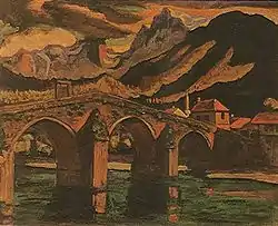 El Viejo puente de Konjic, óleo sobre cartón de Lazar Drljaca 1930.