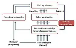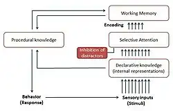 El modelo de inhibición de distractores es el más antiguo y explica el efecto de la preparación negativa como resultado de la atención selectiva a un estímulo diana. Cuando prestamos atención a un estímulo concreto, percibimos otros estímulos que rodean al objetivo como distractores para ayudar a centrarnos. Pero cuando uno de esos distractores se convierte en el nuevo objetivo de la atención, nuestra respuesta al objetivo se ve obstaculizada debido a la inhibición de la memoria inmediata.[5][6] La atención selectiva es la capacidad de responder a un objeto específico cuando hay otros distractores que también compiten por una respuesta. Para explicar esta atención selectiva, el modelo de inhibición del distractor propone un mecanismo dual que implica la excitación para potenciar la señal del objetivo y la inhibición para suprimir los distractores. Esta inhibición se desencadena cuando se produce un desajuste entre las representaciones internas del objetivo y de un distractor. La inhibición de la representación interna del distractor es una forma de ayudar a atender selectivamente al estímulo diana. Esta inhibición decae gradualmente cuando el estímulo ya no está presente para ayudar con el siguiente objetivo. Sin embargo, si un estímulo distractor se vuelve a encontrar como el objetivo, la representación interna del estímulo distractor puede seguir siendo suprimida porque es demasiado pronto para que la decadencia se disipe ya. Esto se denomina inhibición residual transitoria. Esta inhibición también dificulta el procesamiento de una respuesta adecuada al nuevo estímulo diana y provoca un mayor tiempo de reacción.[5][7]