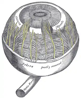 La presbicia es el resultado de la pérdida de la capacidad de acomodación del ojo, lo cual ocurre en toda la población a partir de los 40 años.[5] La acomodación es la capacidad que nos permite ver con nitidez objetos cercanos a expensas de la función del músculo ciliar que cambia la forma del cristalino y aumenta el poder óptico del ojo. La función del músculo ciliar depende del grado de estimulación parasimpática de los receptores muscarínicos. El ojo humano infantil tiene la capacidad de pasar del enfoque de objetos lejanos a otros próximos, a una distancia muy corta de unos 5 cm, gracias a su gran poder de acomodación, de unas 20 dioptrías.