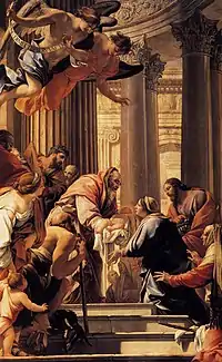En él, Vouet representa la escena evangélica[1] de la Presentación de Jesús en el Templo, una de las más representadas en la historia del arte. María presenta a su hijo al anciano Simeón que lo recibe envuelto en paños. Al lado, José lleva una pequeña jaula con el sacrificio de dos tórtolas.[2]